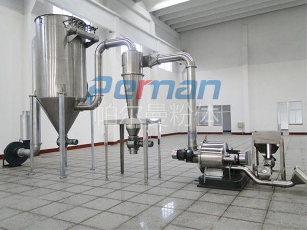 物料由加料系統(tǒng)均勻的送入粉碎室受到高速旋轉(zhuǎn)的粉碎盤(pán)的強(qiáng)烈沖擊,同時(shí)受到離心力的作用,與粉碎齒圈發(fā)生碰撞,受到剪切、摩擦、碰撞等多種綜合力的作用,使物料粉碎,被粉碎的物料隨氣流運(yùn)動(dòng)到分級(jí)區(qū),通過(guò)變頻調(diào)節(jié)的分級(jí)輪,對(duì)粗細(xì)物料進(jìn)行分離,符合細(xì)度要求的產(chǎn)品隨氣流進(jìn)入旋風(fēng)收集器和除塵器收集,粗物料返回分級(jí)區(qū)二次粉碎。