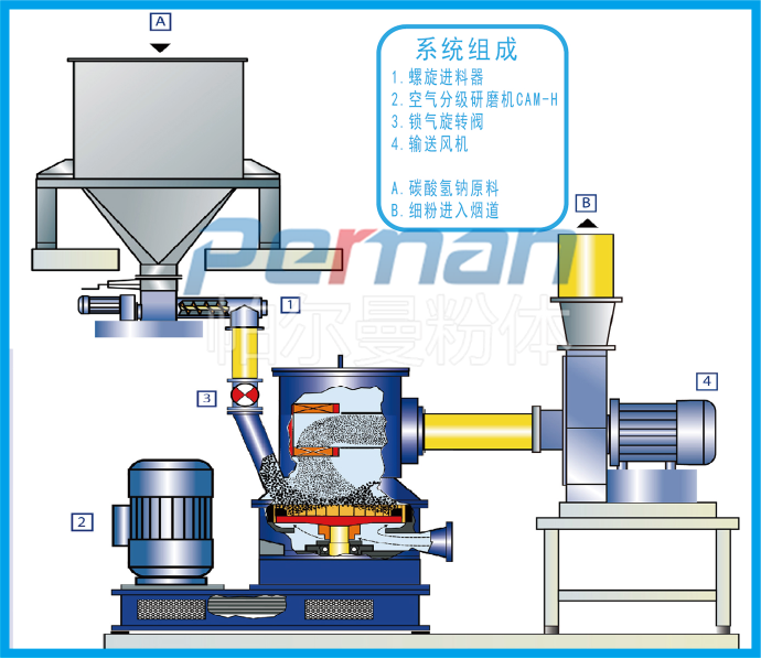 碳酸氫鈉通過失重螺旋喂料稱定量均勻喂料進入CAM空氣分級磨,通過高速旋轉的磨塊與齒圈形成碰撞,摩擦,剪切多種作用力下粉碎,粉碎后隨氣流進入分級區,合格的物料通過分級輪進入煙道進行反應,粗料落入粉碎區繼續粉碎,顆粒的大小可調整分級輪的大小獲得。