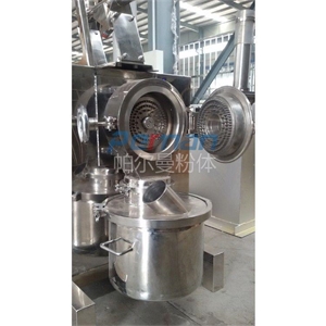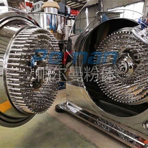 3、磨盤式:物料從進料管進入由靜盤和動磨盤組成的粉碎腔,由于動盤的高速旋轉和風機的作用下,使物料不斷被剪切、撞擊、摩擦,顆粒越來越小,并向外移動,最后經過出料管由集料系統收集。