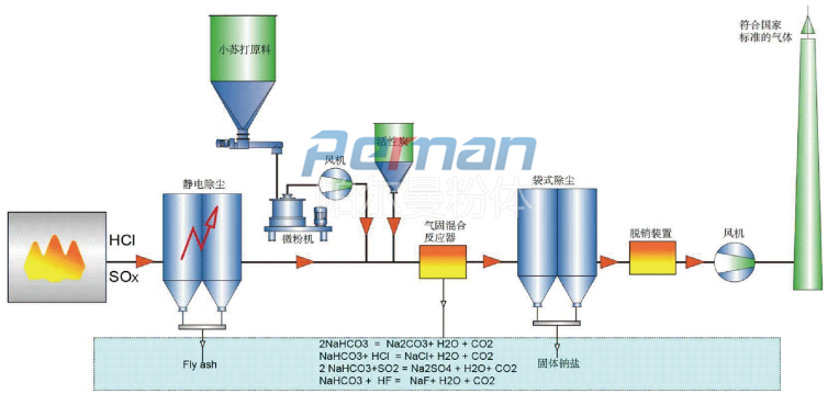 煙氣中含有大量的酸性氣體,經過大量的數據和實驗,只有碳酸氫鈉(小蘇打, NaHCO3)小到一定的程度,其才能和煙氣中的酸性成分產生最大效率的反應。它通過化學吸附去除煙氣中的酸性污染物,同時還可通過物理吸附去除一些無機和有機微量物質。此工藝將碳酸氫鈉細粉直接噴入高溫煙氣。在高溫下碳酸氫鈉分解生成碳酸鈉Na2CO3、H2O和CO2。