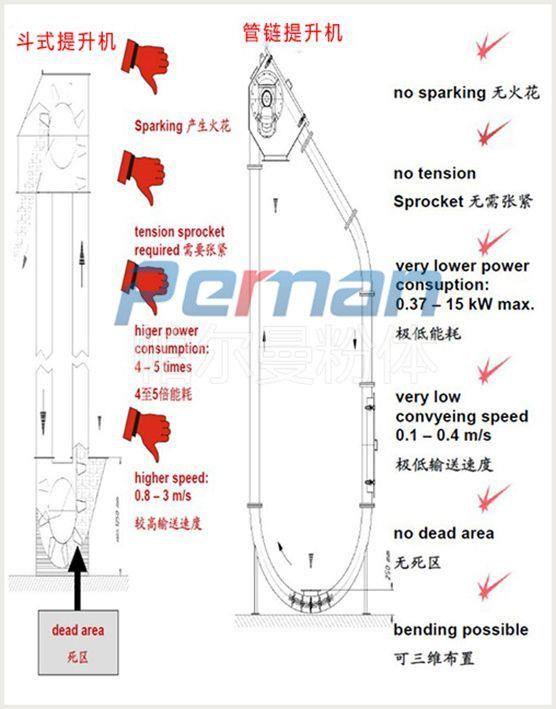 管鏈輸送機在輸送物料過程中,具有埋刮板輸送機輸送能力大,使用壽命長、維修費用低,密封性好,安全,耗能低的特點,也具備斗式提升機的垂直輸送的能力,同時布置更為靈活(水平-垂直/傾斜-水平),密封性能更高。物料垂直輸送中無回料,不破壞物料,不揚塵的特點。在輸送含水物料、易吸附物料、比重很輕的物料時,在機箱內可安裝電動清掃器。